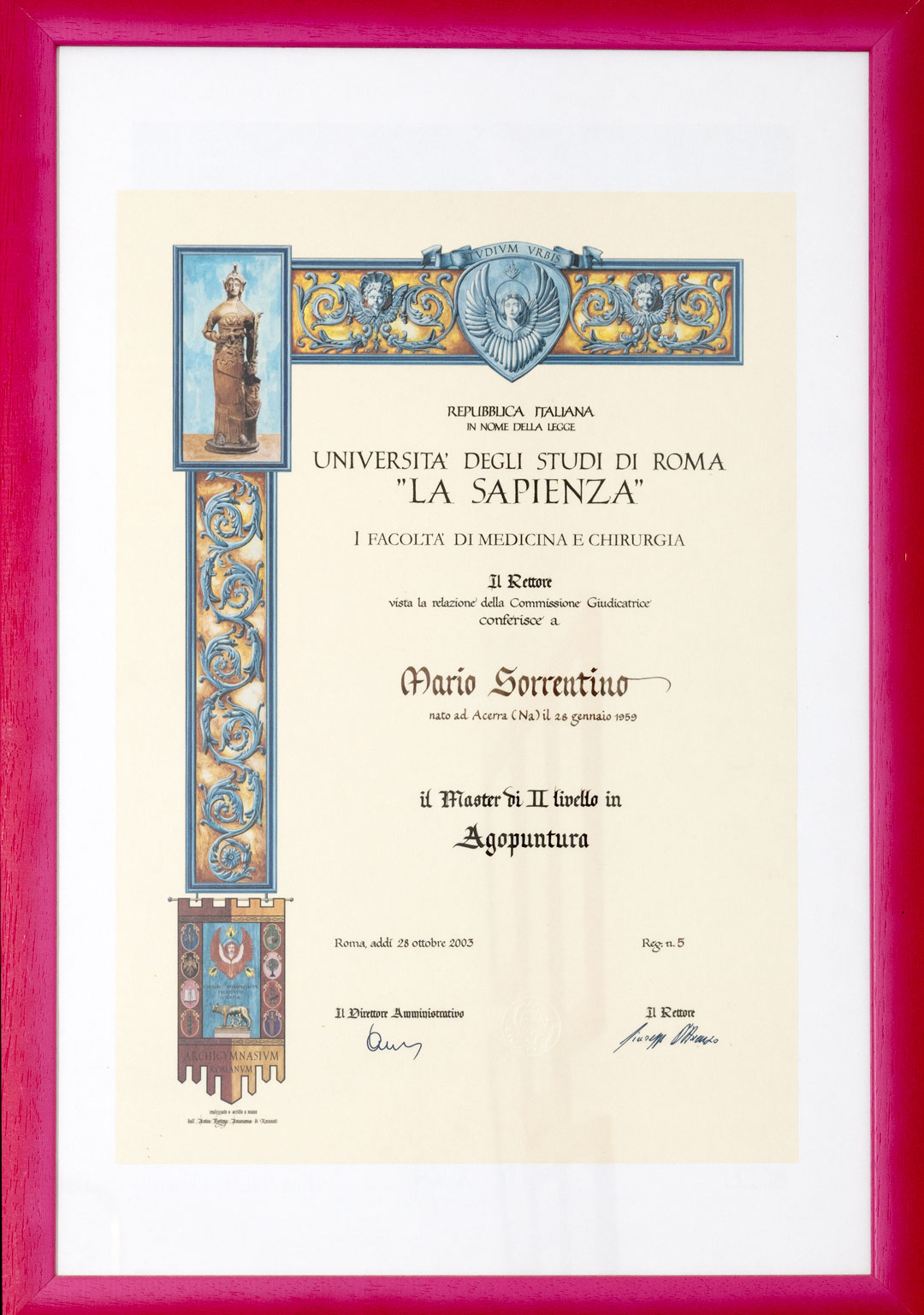 Laureato in Medicina presso l'Università La Sapienza di Roma, Master di II livello in Agopuntura sempre presso l'Università La Sapienza.